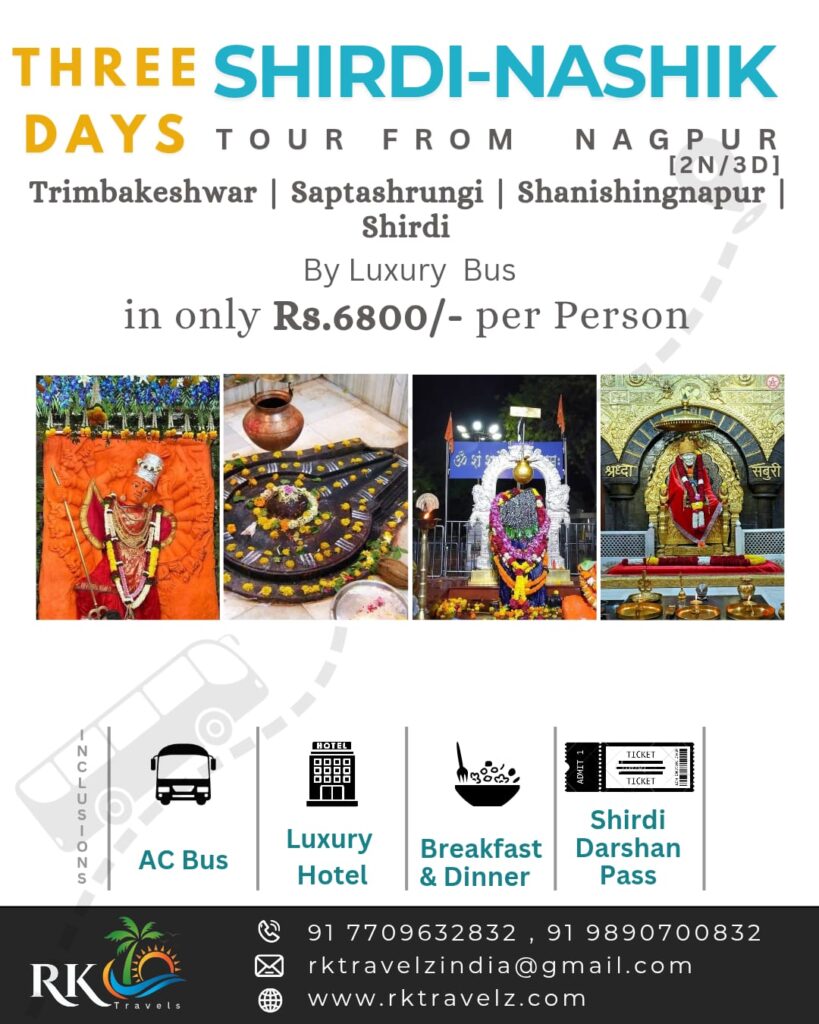 Experience divine blessings with this 3-day spiritual journey covering one sacred Jyotirlingas – Trimbakeshwar in Nashik. Also explore the serene town of Saptashrungi which is one of the Shaktipeeth en route. After that we proced to Shanishingnapur and Shirdi.